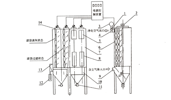 反吹空氣通過電動三通閥進入箱體后,與過濾狀態(tài)相比反向通過濾袋,與此同時,高頻電振器開始動作,使濾袋隨這作高頻震動。在反吹及高頻振動的同時作用下起到清灰的效果(清灰時間是可調(diào)的)。清灰結(jié)束時高頻電振停止振動。電動三通閥主閥板打開,付閥同時關(guān)閉,又恢復了正常過濾狀態(tài)??梢园凑招枰{(diào)整清灰的相鄰間隔時間、使各箱體按指定的時間依次序進行清灰。