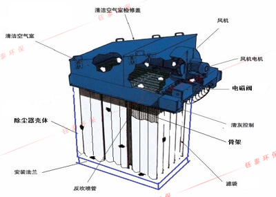 含塵空氣由風(fēng)口進(jìn)入除塵器箱體內(nèi),細(xì)小塵粒由于濾袋的多種效應(yīng)作用,被滯阻在濾袋外壁。凈化后的氣體通過濾袋從上箱體出風(fēng)口排出。隨著使用時間的增長,濾袋表面吸附的粉塵增多,濾袋的透氣性減弱,使除塵器阻力不斷增大。為保證除塵器的阻力控制在限定的范圍之內(nèi),由脈沖控制儀發(fā)出信號,循序打開電磁脈沖閥,使氣包內(nèi)的壓縮空氣由噴吹管各噴射到對應(yīng)的骨架(稱為一次風(fēng)),并在高速氣流通過骨架時誘導(dǎo)數(shù)倍于一次風(fēng)的周圍空氣(稱為二次風(fēng))進(jìn)入濾袋,造成濾袋瞬間急劇膨脹,由于反向脈沖氣流的沖擊作用很快消失,濾袋又急劇收縮,這樣使積附在濾袋外壁上的粉塵被清除。由于清灰是依次分別向幾組濾袋進(jìn)行,并不切斷需要處理的含塵空氣,所以在清灰過程中,除塵器的處理能力保持不變。
