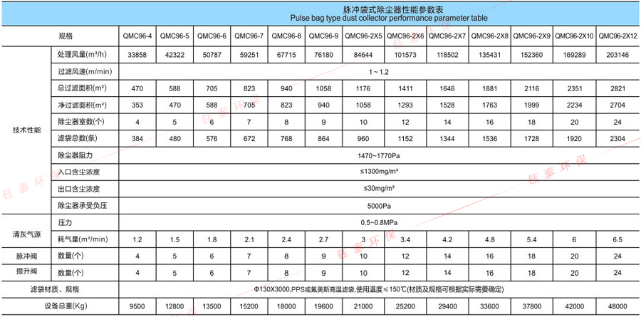 除塵清灰工作過程為:以一個(gè)袋為例,含塵氣體由進(jìn)口處直接進(jìn)入氣箱的袋室;由于有負(fù)壓風(fēng)機(jī)的引力驅(qū)動(dòng)作用,含塵氣體由外及里,自下而上,克服阻力,穿越濾袋到達(dá)上部箱體;粉塵就會(huì)被阻擋在濾器組件之外,小的顆粒被吸附在濾芯的表面,大的顆粒直接掉到下面的灰斗中;經(jīng)過過濾后的含有微塵的氣體在脈沖提升閥處匯集,之后從出風(fēng)口排出,此時(shí)便是干凈的氣體。過濾狀態(tài)就是對(duì)含塵氣體進(jìn)行除塵。當(dāng)過濾工作達(dá)到一定時(shí)間(或阻力達(dá)到預(yù)先設(shè)定值),清灰過程開始。其工作過程為:控制器發(fā)出信號(hào),使脈沖提升閥關(guān)閉,阻斷排氣;壓縮空氣脈沖閥開啟,以大于0.5MPa的壓縮空氣經(jīng)脈沖閥噴入凈氣室;并迅速膨脹入濾袋內(nèi),并產(chǎn)生振動(dòng)作用,清除濾袋外側(cè)表面上的粉塵,粉塵掉落到灰斗。這個(gè)動(dòng)作完成后(大約6~15s),壓縮空氣脈沖閥關(guān)閉,提升閥重新打開,該箱室的濾袋重新回到過濾狀態(tài)。