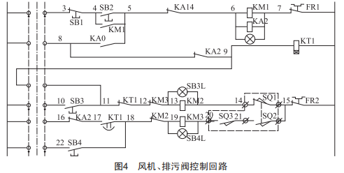 風(fēng)機、排污閥控制回路如圖4所示,圖中3~22為接線端子編號,KA14為基本水位繼電器常閉節(jié)點,除塵器長時間處于停運狀態(tài)并且排污閥存在漏水現(xiàn)象,水箱內(nèi)部大部分水流失。遠程啟動風(fēng)機時,負壓對水箱水位造成波動,使基本水位信號消失,KA14斷開,風(fēng)機停運聯(lián)鎖排污閥打開,同時進水電磁閥動作,KT1計時時間到后排污閥關(guān)閉。關(guān)閉到位,進水電磁閥保持進水,基本水位信號亮起,KA14閉合,風(fēng)機啟動,造成基本水位信號消失。之后不斷循環(huán)以上步驟,浪費大量水源及影響設(shè)備正常運行,需要及時對排污閥漏水問題進行處理。