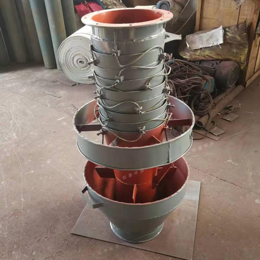 制作外伸縮布袋方式:要求伸縮布袋上每2個(gè)相鄰漲圈之間的垂直間距必須≤10cm,見(jiàn)圖1。當(dāng)外伸縮布袋折疊后2個(gè)相鄰漲圈之間的布袋向內(nèi)褶皺時(shí),不能阻擋住與內(nèi)直鋼套筒外壁之間形成的環(huán)形負(fù)壓吸塵通道的橫截面,從而降低負(fù)壓吸塵的通過(guò)量??蛻羰褂矛F(xiàn)場(chǎng)反饋漲圈間距大的吸塵氣流明顯比漲圈間距小的吸塵氣流更加順暢。