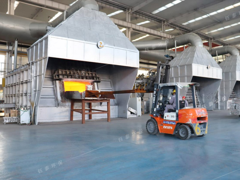 再生鋁雙室爐煙氣處理系統(tǒng)采用XLP高效旋風(fēng)除塵器+強(qiáng)制排風(fēng)冷卻器+脈沖布袋除塵器組成,雙室爐爐門(mén)排煙采用2個(gè)排煙罩,2個(gè)爐門(mén)罩交替打開(kāi);并配套爐膛排料輔助排煙系統(tǒng),1套雙室爐煙氣處理系統(tǒng)處理風(fēng)量≥130000m3/h。除塵器運(yùn)行后將雙室爐燃燒過(guò)程產(chǎn)生的高溫?zé)煔猓囟龋?50℃)和爐門(mén)罩排出的煙氣全部收集干凈,保證了工人的操作環(huán)境,達(dá)到了規(guī)定的排放標(biāo)準(zhǔn),給生產(chǎn)企業(yè)帶來(lái)了巨大的經(jīng)濟(jì)效益。除塵器收集的顆粒污染物主要是熔煉過(guò)程中產(chǎn)生的金屬氧化物和非金屬氧化物,還有大量碳粒灰份等,除塵脫硫后:煙塵濃度:≤10mg/m3。