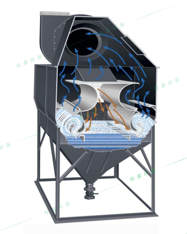 該除塵器分上、下箱體兩大部分,上箱體包括:進(jìn)出風(fēng)管、分配送風(fēng)通道、兩道擋水板、沖洗裝置等。下箱體包括:泥漿斗、加熱裝置等。該除塵器另外還有:排漿閥、液位控制儀、電磁閥和壓差計(jì)等。